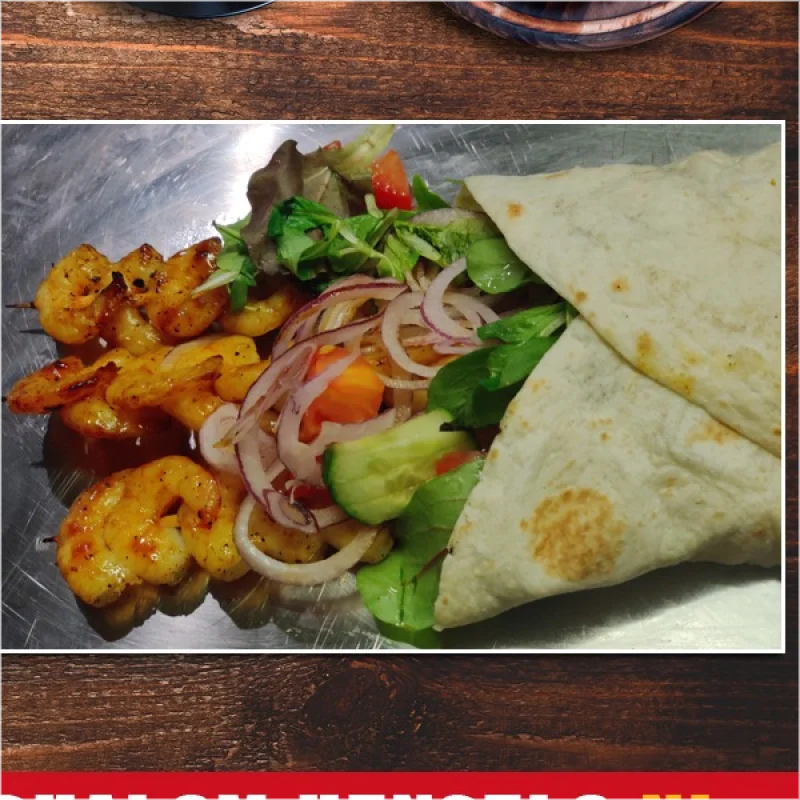 Durum gevuld met heerlijke gemarineerde garnalen champignon,ui en paprika (met Ribmansaus!) en salade.